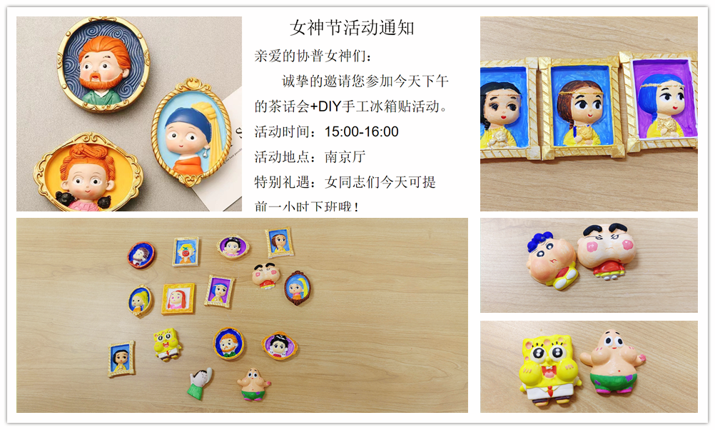 ,大家悠閑地完成了各自的手繪冰箱貼,活動結(jié)束后全體女同志提前下班,開心地結(jié)束了一天的工作。